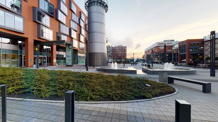 Plac o powierzchni ok. 6600 m kw. z fontannami, ławkami i dekoracyjnym oświetleniem zapewnia komunikację pieszą pomiędzy centrum handlowym, a biurowcami. Ponadto stanowi miejsce spotkań oraz odpoczynku. Wyróżniającym się elementem jest poprzemysłowy, 100-metrowy komin, przypominający o przeszłości tego miejsca.